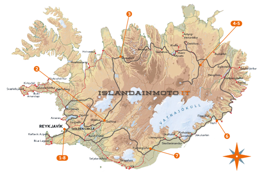 Si parte per il fiordo di Hvalfjordur dove la strada tortuosa permette di divertirsi fra scenari unici che si riflettono fra l'acqua blu del fiordo e i prati verdi delle montagne. Si arriva presso la riserva naturale di Husafell prima di inoltrarsi nel deserto di Kaldidalur dove la pista 550 fiancheggia il ghiacciaio Langjokull. Si scende verso sud e si entra nel Parco Nazionale di Thinvellir (piana dell'assemblea) dove si effettua una gradevole camminata in mezzo alle placche tettoniche fino alla sede del più antico parlamento del Mondo: l'Althing (930 d.C.). Qui si trova l'omonimo lago Thingvallavatn che rende il paesaggio dolce e rilassante. Si prosegue per la cascata Gullfoss (cascata d'oro) e si termina la giornata visitando la riserva naturale di Geysir dove il geyser Strokkur (la zangola), erutta un getto d'acqua alto circa 30 metri ad intervalli irregolari di 3/5 minuti. In questa zona, risiede il Grande Geyser (ora inattivo), dal quale prende il nome il fenomeno.